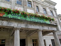 Als wir im Schlosshof ankamen, sahen wir schon von weiten ein Banner am Balkon oberhalb des Einganges mit der Aufschrift: