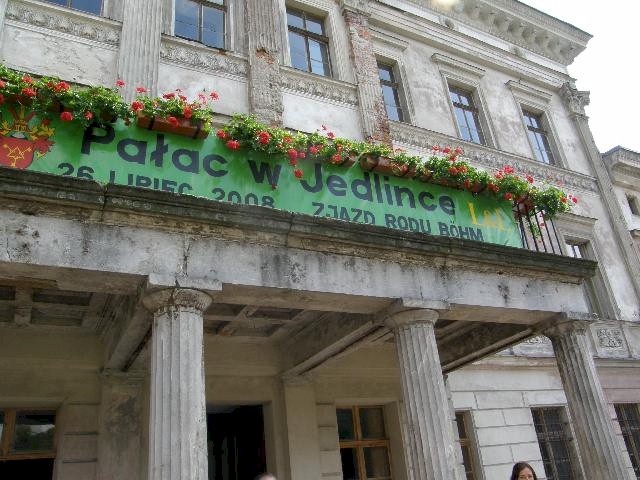 Es folgte die Begrüssung durch die Familie Leda, den neuen polnischen Schlossbesitzern. Der Direktor der Schlossanlage, Dr. Dariusz Woznicki, stellte uns den geladenen Gästen vor. Anschliessend ein Umtrunk und eine Führung durch die Empfangsräume. Das Polnische Fernsehen sowie Radio Wroclaw (Radio Breslau) waren anwesend. Unser Schnitt ist 2:30 Minuten, siehe TV-Reportage: Familientreffen Böhm im Palac Jedlinka/Schloss Tannhausen 2008 TV-Bericht
