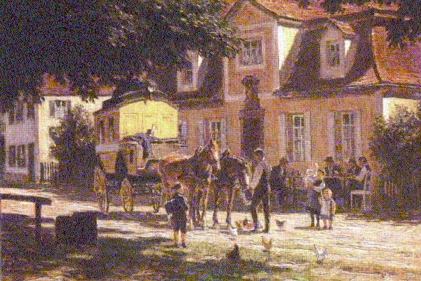 "1830 am 6.August kam der Kronprinz und nachmalige König Friedrich Wilhelm IV mit seinem Gefolge von Salzbrunn durch unser Dorf und fuhren über Friedland, Adersbach, Trautenau nach dem Riesengebirge. In hiesiger Schölzerei erwartete der Landrat Graf Rechenberg die Herrschaften. Auch wurden hier frische Reisepferde vorgelegt."