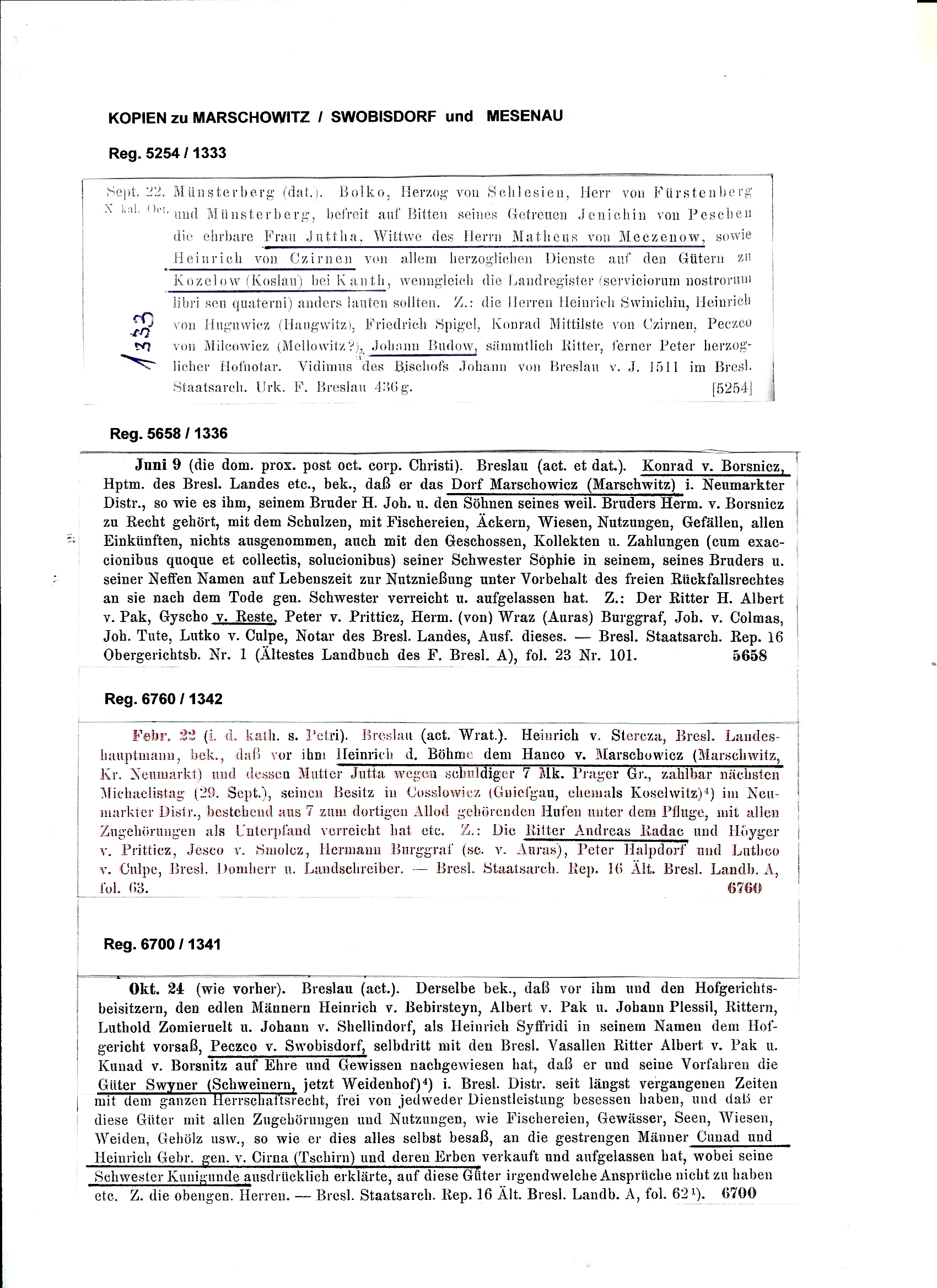 Kopien der Regesten zu Marschowitz / Swobisdorf / Mesenau