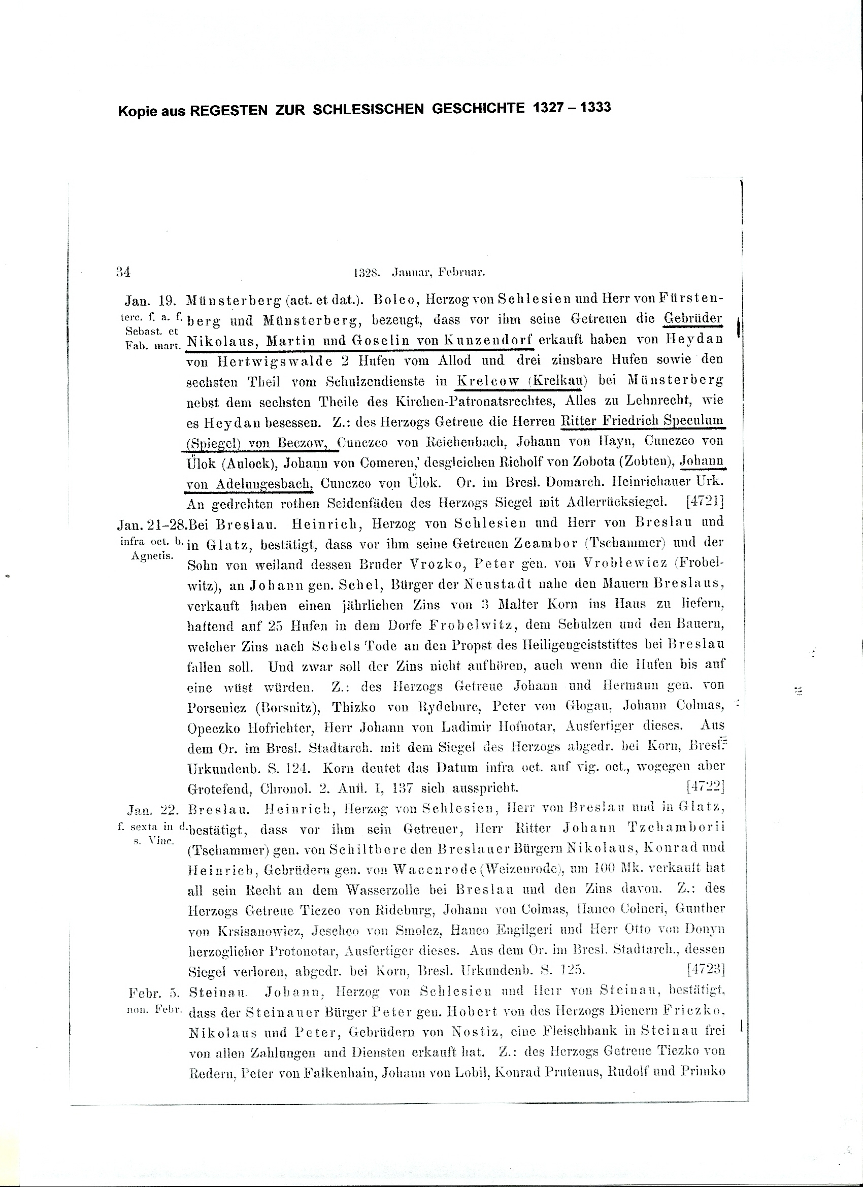 9.11.1342, Jauer. Heinrich Hzg. von Fürstenberg & Jauer bekennt, daß Ritter Peschko der Böhme dem Kloster Grüssau 30 Scheffel Mais auf dem Allod des Bürgers in Jauer Peschko von Görlitz sowie 1 Vierdung auf der Kaufkammer des Schneiders Jeckelin als jährlichen Zins verreicht hat. Zeugen: Creczing v ZD, Reinsco Ovis, Cunad v ZD, Siffrid Ruszindorf, Tizko Buch, Heinrich v Ziegenberg, Bernhard v Waldow, hzgl. Protonotar. SR 6949