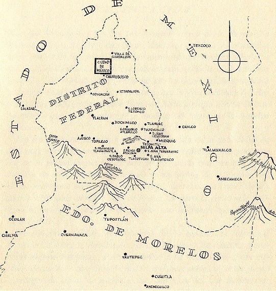 Dominación españolaNo fue hasta 1528 cuando se pactó la paz con los pueblos de la región. Lograron de la Real Audiencia, en 1529, el reconocimiento de sus propiedades y el derecho a elegir los gobernantes locales, pero a cambio debían ofrecer tributos al rey de España, dejar de adorar a sus dioses y aceptar a los misioneros que irían para convertirlos a la religión católica. Pronto llegó un representante del gobierno español, acompañado por los primeros frailes franciscanos, encargados de evangelizar a los indios lugareños; la primera acción fue bautizar a los caciques para convencer, de esta manera, a los demás. Poco después los religiosos levantaron una modesta ermita consagrada a Santa Martha. Para 1545 existía también la ermita de Tlatlapacoyan, en el lugar donde después fue erigido el calvario de San Lorenzo. Los indios de la localidad, a pesar de estar sometidos, seguían resistiendo el avance de los españoles; en 1570 cedieron los terrenos que se destinarían al convento y templo de La Asunción, cuya edificación tardó más de cien años concluirse. Además del catolicismo, los religiosos introdujeron nuevos cultivos y variedades de árboles frutales; hubo también, durante mucho tiempo, huertos de olivo. En 1590 se prolongó en acueducto prehispánico proveniente de Tulmiac, y en 1596 se hicieron seis tanques de almacenamiento. Se construyeron en esta región otros dos conventos franciscanos, uno de San Pedro Actopan y otro dedicado a San Antonio de Padua, en Tecómitl; se conserva un pequeño claustro de este último. La entrada a la Ciudad de México desde el sur se hacía por dos caminos que pasaban por Milpa Alta; uno venía de Tepoztlán y Cuernavaca, el otro de Cuautla, Oaxtepec y Tlayacapan. Después de Milpa Alta proseguía por las lagunas hasta la garita de Jamaica donde se pagaba la alcabala, antigua especie de impuesto aplicado a las mercancías que se venderían en la capital, con base en un porcentaje del precio establecido en el contrato de compra-venta. Milpa Alta en el México independiente Una vez declarada la Independencia, se definió para el país la organización de una República con estados soberanos; el gobierno nacional o federación de estados requería de un territorio perteneciente a todos, pero ninguno en particular. El 18 de noviembre de 1824, el Congreso señaló a la Ciudad de México como cede oficial de los poderes de la nación y le asignó al Distrito Federal la superficie de dos leguas de radio, es decir 8 800 metros, con centro en la Plaza Mayor, territorio que fue tomado del Estado de México, el cual debió mudar su propia cede, inicialmente a Texcoco. La ley del 18 de abril de 1826 dispuso que los pueblos cuyos habitantes vivieran fuera del círculo distrital, seguirían perteneciendo al Estado de México, por lo que Milpa Alta volvió a formar parte de éste. El siglo XIX fue una época de constantes luchas en el país entre dos tendencias: liberales y conservadores. La primera buscaba el desarrollo del país mediante una confederación de estados independientes, es decir un gobierno federal, procurando que todos los sectores de la sociedad resultaran beneficiados, mientras que los segundos buscaban mantener los privilegios de las clases que dominaron durante el virreinato, con un gobierno central. Al triunfo del centralismo, el Distrito Federal desapareció y su territorio fue incorporado al Departamento de México. La República quedó dividida en departamentos, éstos en distritos, a su vez conformados por partidos, además de subsistir los ayuntamientos. Formalmente la Ciudad de México se agregó al Departamento de México en febrero de 1837, con lo cual Milpa Alta se reintegró a dicha entidad. El 22 de agosto de 1846, cuando la República fue formalmente restablecida, se dispuso que sigiera de nuevo la Constitución de 1824 y se restituyeron los estados en lugar de los departamentos. Milpa Alta volvió a formar parte del Estado de México. El 26 de febrero de 1854, el presidente centralista Antonio López de Santa Anna decretó una nueva definición para el distrito de México: al norte hasta el pueblo de San Cristóbal Ecatepec; por el noroeste llegaba a Tlalnepantla; por el oeste a los Remedios, San Bartolo y Santa Fe; por el suroeste, a Huixquilucan, Mixcoac, San Ángel y Coyoacán; por el sur a Tlalpan, Xochimilco e Iztapalapa; por el este al Peñón; por el noreste hasta la medianía de las aguas del lago de Texcoco. La municipalidad de lo que fue Malacachtepec Momoxco pertenecía a la prefectura de Tlalpan, debido a lo cual este territorio nuevamente se reintegró al Distrito Federal. Hacia 1856 ya eran muy escasas las aguas del manantial de Tulmiac. Durante la segunda mitad del siglo pasado la población de la localidad se dedicaba fundamentalmente a la agricultura: en las lomas se cultivó el maíz, cebada, frijol, papa y trigo, además de capulín, maguey, nopal y olivo en las partes bajas. Había otras actividades productivas, por ejemplo la explotación de maderas como el ocote, oyamel, tepozan y sauz; también llevaban a vender a los pueblos vecinos y a la ciudad, elaborados o recolectados por ellos mismos, pulque, aceite, leña y, en menor escala, carnes, yerbas, chiles, pambazos y tortillas. Para 1890 había 7 213 habitantes en la municipalidad, 3 657 de los cuales vivían en la cabecera. En 1899 el Distrito Federal fue dividido en la municipalidad de México y seis prefecturas, cada uno formada por municipalidades; Milpa Alta era una de las siete municipalidades de la prefectura de Xochimilco. En 1903 se configuró otra división para el Distrito Federal, esta vez con trece municipalidades, una de las cuales era Milpa Alta, ya separada de Xochimilco. En 1910, la población de la villa de Milpa Alta era de 4 720 habitantes; éstos más los de pueblos, haciendas y ranchos de la municipalidad, sumaban 15 900 en total. Anécdotas y Recuerdos de la Vida de mi Padre, Prof. Román Medina Rojas (1908-19